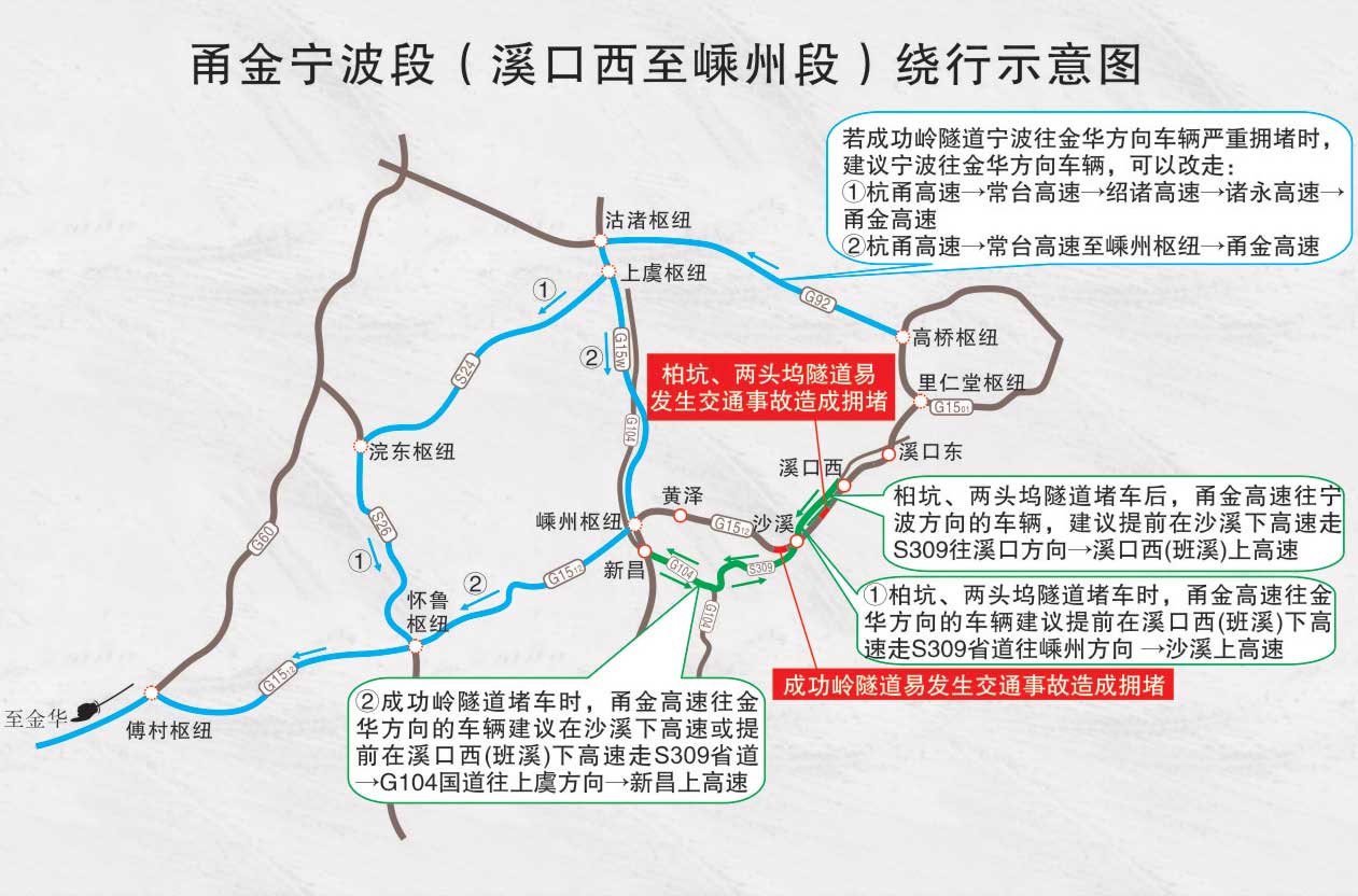 桕坑、兩頭塢隧道發(fā)生擁堵,甬金高速往金華方向的車輛建議提前在溪口西(班溪)下高速走S309省道往嵊州方向→沙溪上高速;若成功嶺隧道堵車,建議在沙溪下高速或提前在溪口西(班溪)下高速走S309省道→G104國道往上虞方向→新昌上高速。