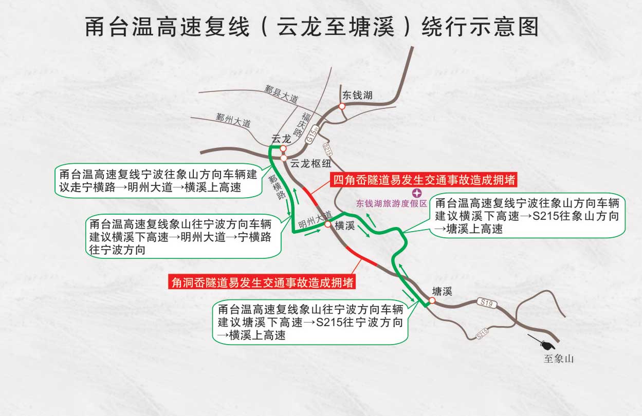 甬臺溫寧波段(寧海北至寧海南)的塔珠嶺、桑洲嶺、麻岙嶺隧道易發(fā)生交通事故造成擁堵。如遇擁堵情況,沈海高速(甬臺溫段)寧波往寧海方向車輛建議在寧海北下高速→S214往寧海方向→寧海上高速;寧海往寧波方向車輛建議在寧海下高速→S214往寧波方向→寧海北上高速;寧海往三門方向車輛建議在寧海南下高速→S214往三門方向→三門上高速;三門往寧海方向車輛建議在三門下高速→S214往寧海方向→寧海南上高速。
