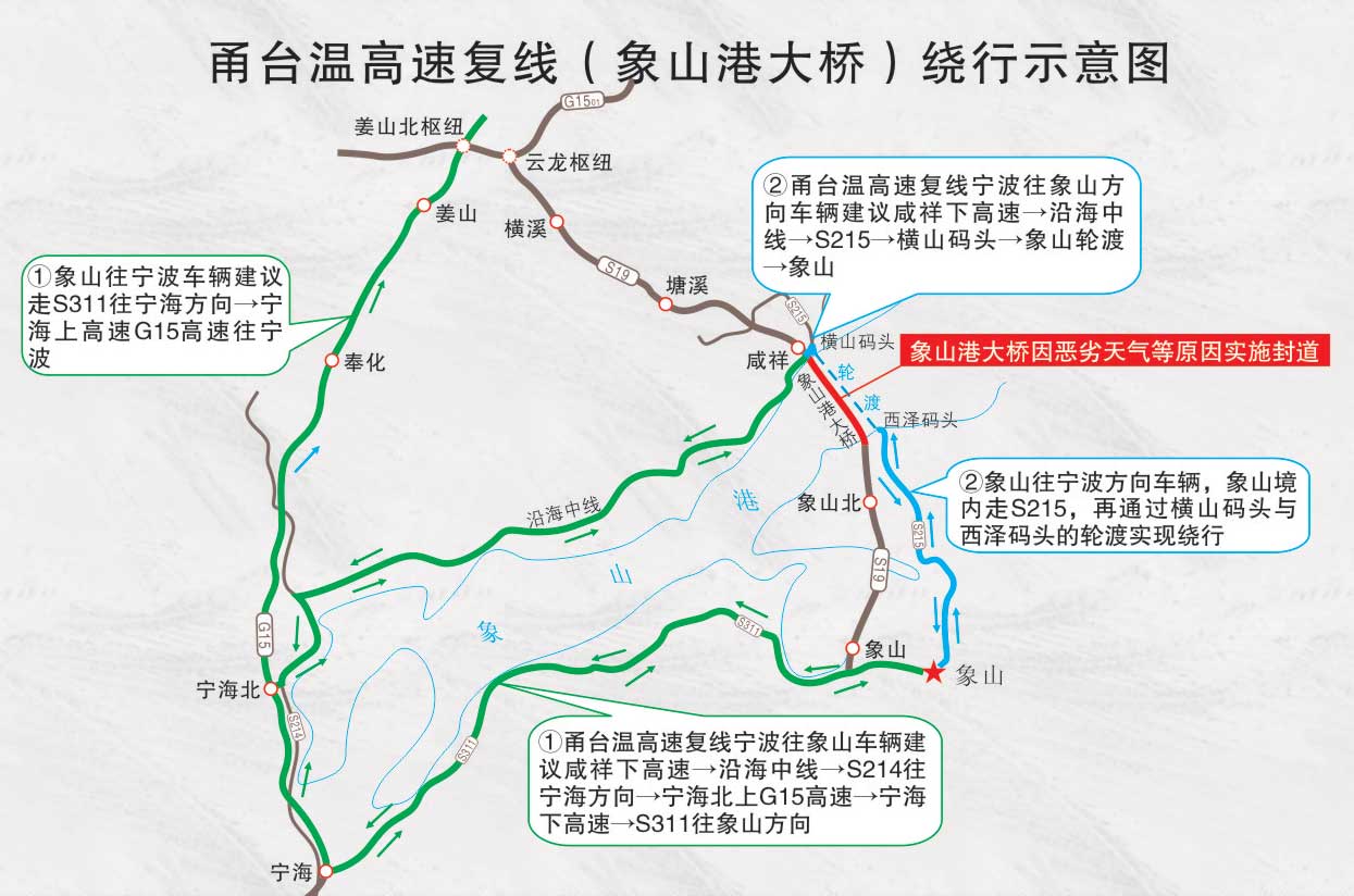 如角洞岙隧道擁堵,甬臺溫高速復線象山往寧波方向車輛建議塘溪下高速→S215往寧波方向→橫溪上高速;寧波往象山方向車輛建議橫溪下高速→S215往象山方向→塘溪上高速。