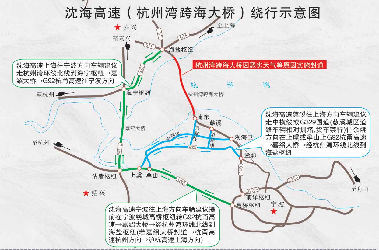 沈海高速寧波往上海方向車輛建議提前在寧波繞城高橋樞紐轉(zhuǎn)G92杭甬高速→嘉紹大橋→經(jīng)杭州灣環(huán)線北線到海鹽樞紐(若嘉紹大橋封道→杭甬高速杭州方向→滬杭高速上海方向);