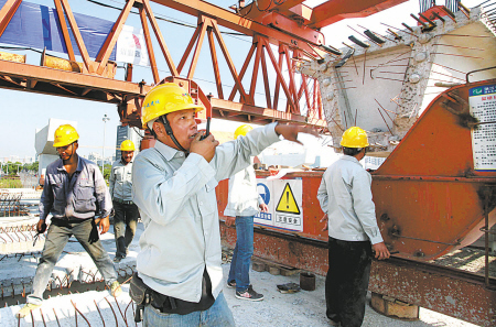 9月13日,在我市重點工程機場路(青林灣大橋-江北大道)快速化改造工程工地,寧波建設集團架梁機正在架梁。據(jù)市通投公司介紹,該項目總投資約6.7億元,南起青林灣大橋北引橋,北至江北大道,主線全長2.42公里。目前工程進度已過半,計劃于明年底前建成。