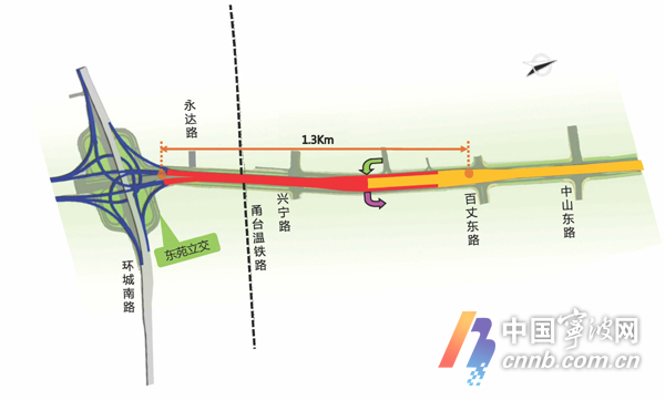 世紀大道快速路(東苑立交-百丈東路南)一期工程為寧波市重點城建項目。工程南起東苑立交,北至百丈東路,建設全長約1300米,道路紅線寬度108米。