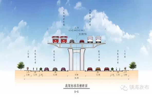 建設標準:全長約4.1公里,寬度68米,采用“主線+輔道”的建設形式。主線建設標準為城市快速路,設計車速80公里/小時;地面輔道建設標準為城市主干道,設計車速50公里/小時。