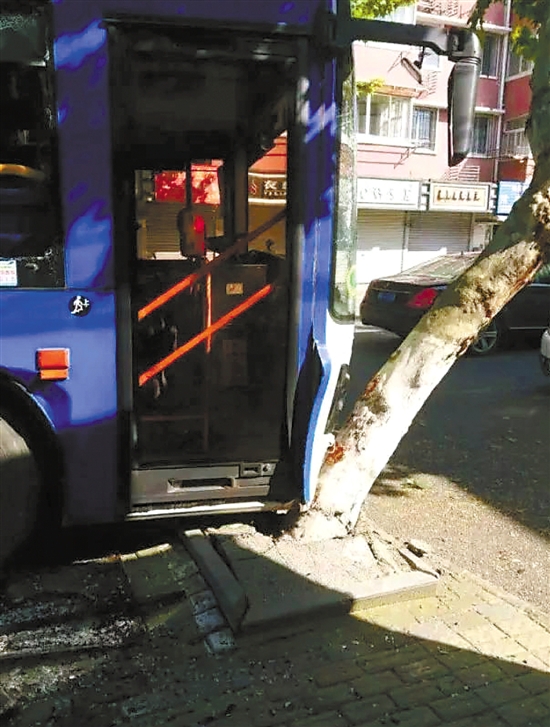 昨天下午兩點,記者來到事發現場,事發的公交車已經被拖走,雖然經過了清掃,但是地上還有零星的碎玻璃。被撞的行道樹有碗口粗細,已經被撞歪了,樹皮也掉了一大塊。
