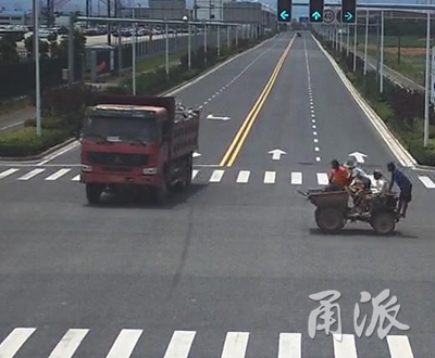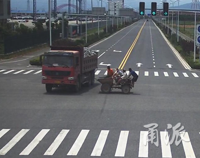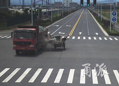 這時(shí),監(jiān)控畫(huà)面右側(cè)出現(xiàn)一輛工地上使用的小型四輪翻斗車(chē)沿港浦路自北向南駛?cè)肼房凇C鎸?duì)紅燈,它居然絲毫沒(méi)有減速的意思,更令人吃驚的是,小小的四輪車(chē)上擠滿(mǎn)了人,其中一人竟然站在前面裝貨用的翻斗內(nèi)!工程車(chē)自卸車(chē)司機(jī)看到危險(xiǎn),緊急向右打方向避讓?zhuān)墒且呀?jīng)為時(shí)過(guò)晚,翻斗車(chē)重重的撞在了工程車(chē)的左側(cè)車(chē)身。