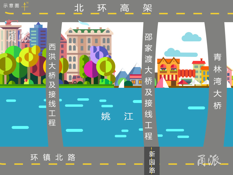 西洪大橋和邵家渡大橋的建設,將打通姚江新區對外通道,進一步完善中心城區骨干路網,大大方便城西和城北之間的交通出行。以慈城古縣衙到高橋鎮政府為例,現在行車時間至少要38分鐘,一旦通過兩座大橋,時間節約一半以上。