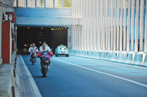 海曙尹江路隧道通車近一年,大大方便了從蒼松路到鄞奉路方向的車輛。但是,記者昨天在路經鐵路寧波站時發現,原本只能通行機動車的尹江路隧道,如今不僅“鉆”進了電動車,連三輪車、自行車也騎了進去,和機動車并行,十分驚險。