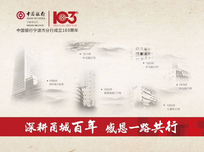 從1914年至2017年,中國(guó)銀行寧波市分行沿著“民國(guó)誕生”、“新中國(guó)新生”、“改革開放再生”的歷史脈絡(luò)砥礪前行,雖歷經(jīng)艱難,始終秉承“為社會(huì)謀福利、為國(guó)家求富強(qiáng)”的歷史使命、追求卓越的精神、穩(wěn)健經(jīng)營(yíng)的理念、客戶至上的宗旨、誠(chéng)信為本的品質(zhì),持續(xù)經(jīng)營(yíng)逾百年。
