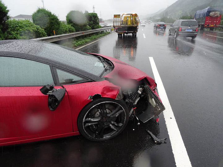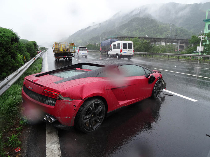 6月13日中午11點(diǎn)30分左右,周師傅駕駛價(jià)值400多萬元的紅色蘭博基尼超級跑車由杭州上高速去寧波,途經(jīng)280k處時(shí),由于雨量較大,加上車速過快,蘭博基尼輪胎打滑,徑直撞上了集卡車的左前輪,在高速上轉(zhuǎn)了好幾個(gè)圈之后才停下,損毀嚴(yán)重。