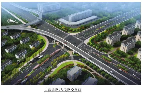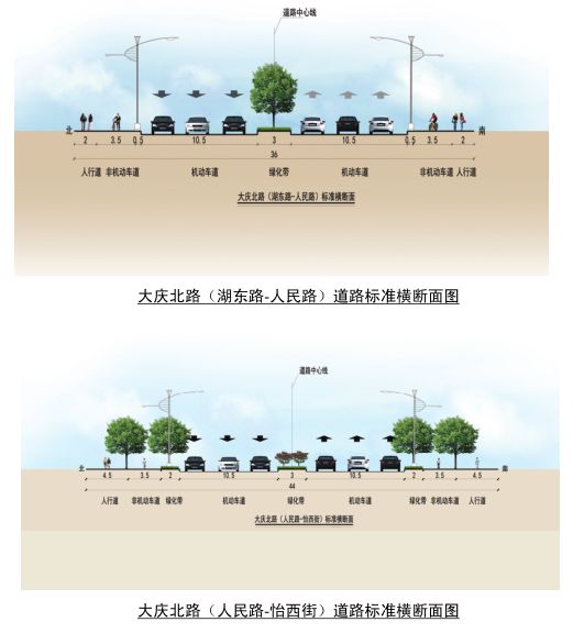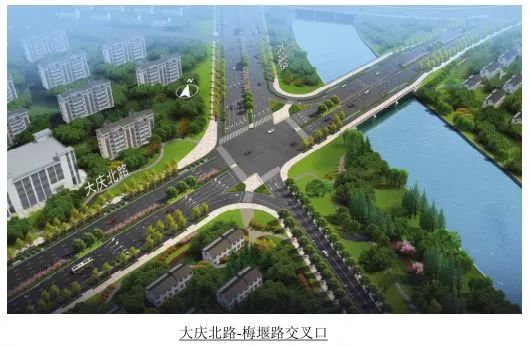 工程主要設計內容包括道路、橋梁、雨污排水管、給水管、道路配套綠化、交通設施以及路燈等。根據規劃,大慶北路(湖東路-怡西街)道路為城市主干路,主線設計行車速度50km/h,其中人民路以西標準斷面寬36米,人民路以東標準斷面寬44米。梅堰路道路等級為城市主干道,標準斷面寬44米。整個大慶北路(湖東路-怡西街)道路工程工期約為500天,總投資約12.84億元。