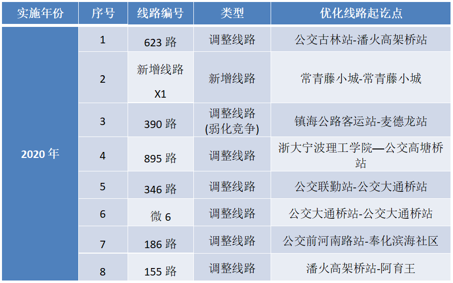 2020年將實施線路8條,其中平行公交線路優化調整3條,接駁線路優化4條,新增1條。