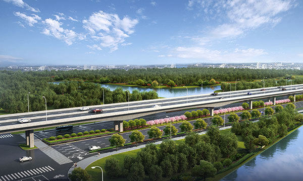 該工程是寧波市中心城區快速路網重要組成部分。一期工程新建高架主線長1.9公里,采用雙向6車道,設計時速80公里;新建、改建地面輔道長2.3 公里,采用雙向6車道,設計時速50公里。項目建設后期的景觀綠化提升工程是寧波大型市政工程最早開始高架亮化美化的工程,成為寧波的門戶(寧波東出口) 的一道亮麗風景。