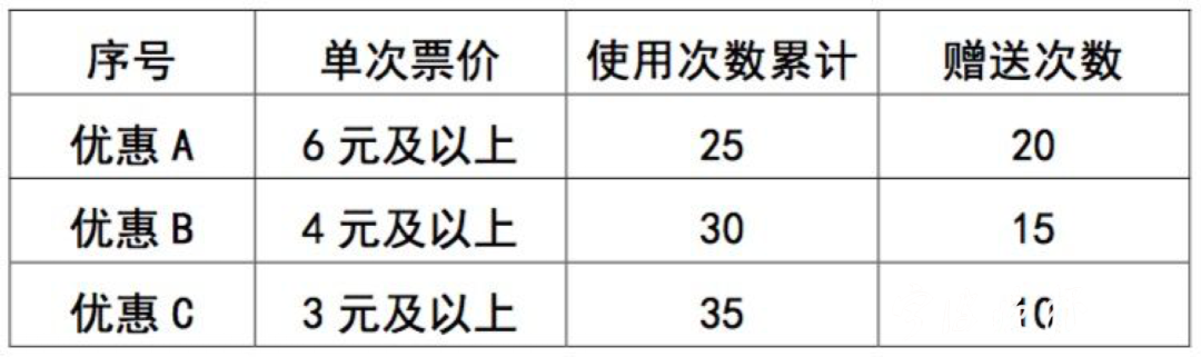 優(yōu)惠C:在一個優(yōu)惠周期內(nèi)乘客使用電子票乘坐地鐵35次及以上且每次票價大于或等于3元,寧波軌道交通將免費贈送10次不計里程的電子票。