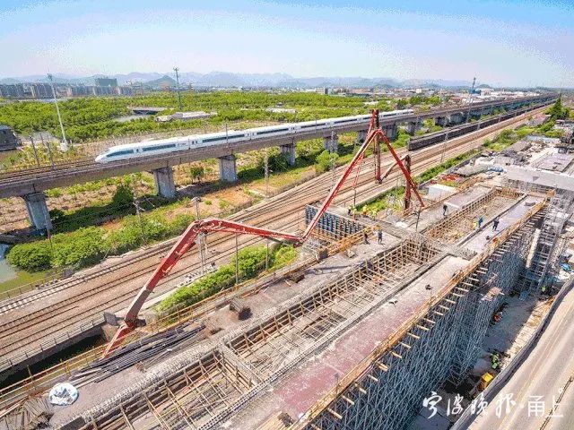 目前,25孔簡支箱梁已全部完成,慈城站正在進行機電設備安裝及裝修施工。節(jié)點工程慈城站至官山河站區(qū)間的轉體橋已完成懸臂現(xiàn)澆施工,正在進行轉體前的各項準備工作,將于近期完成轉體。