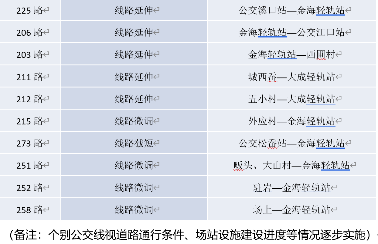 2020年有24條常規(guī)公交線路將進(jìn)行優(yōu)化,包括線路延伸、截短及局部改道等,具體調(diào)整后如下表: