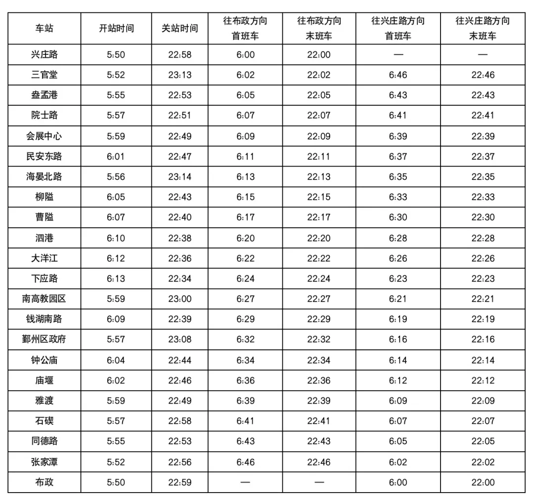 5號線一期單程運行時間48分鐘左右。布政站、興莊路站為5號線一期兩端的始發(fā)站,布政站和興莊路站首班車發(fā)車時間均為6:00,末班車發(fā)車時間為22:00。
