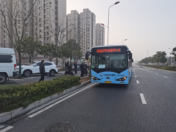 2月14日上午7:25,標(biāo)注著“崇正1號(hào)專線早”和“崇正2號(hào)專線早”的4輛定制公交車,滿載著150余名學(xué)生以及個(gè)別陪同家長,分別從莊市行政服務(wù)中心和翰香景庭西門出發(fā),經(jīng)過20分鐘的車程,到達(dá)了鎮(zhèn)海區(qū)崇正書院西門。