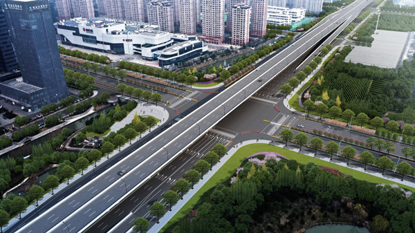 該工程采用“主線高架+地面輔道”的建設(shè)形式,其中主線高架為雙向6車(chē)道,地面輔道為雙向6車(chē)道+兩側(cè)機(jī)非混行道;高架設(shè)計(jì)速度80公里/小時(shí),地面主車(chē)道設(shè)計(jì)速度50公里/小時(shí);同步實(shí)施雨水、電力、燃?xì)狻⒔o水和綜合通信等管線工程,以及景觀綠化工程。