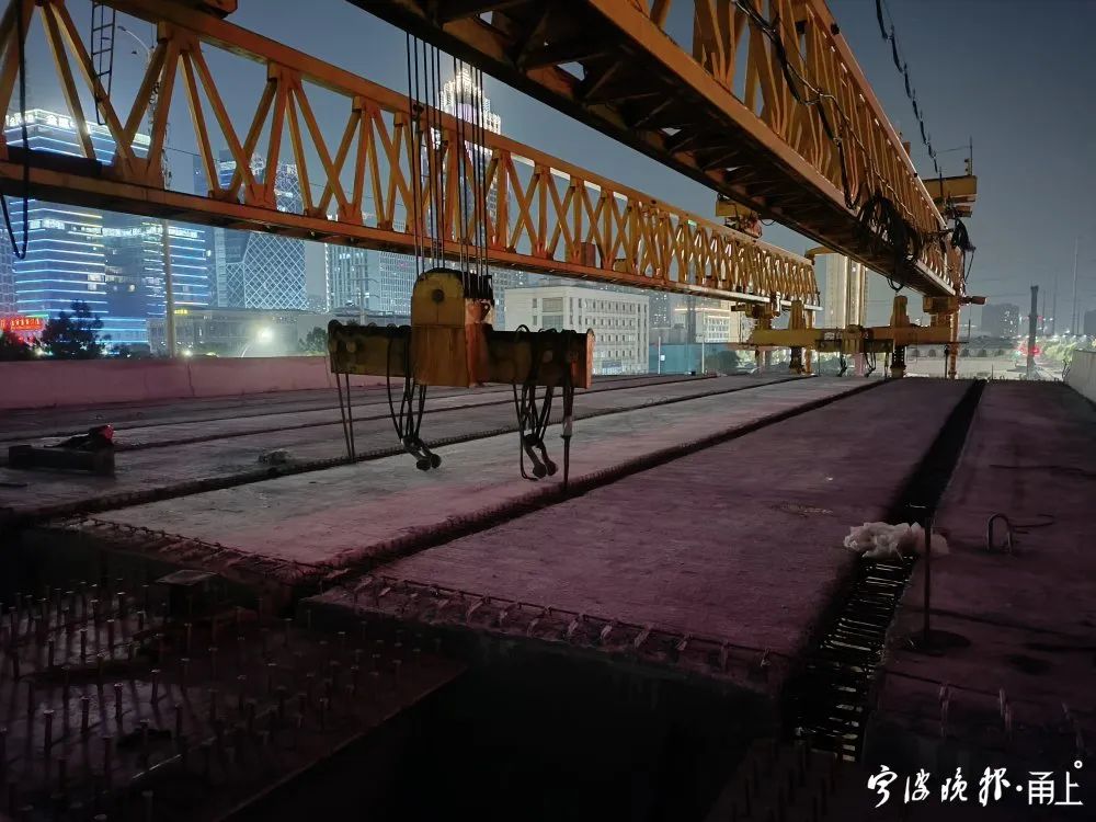 “它山堰路至天童南路段全長1070米,共計279片小箱梁、37片鋼箱梁。因項目地處南部商務區,梁板架設過程中面臨了沿線交通量大、道口情況復雜、邊通車邊施工等諸多挑戰,我們通過采取實時管控、分流引導和時段調整等舉措,確保箱梁架設的安全性。經過連續兩晚的徹夜搶工,終于順利完成了高架結構的架設。”鄞州大道快速路工程鄞州段建設單位項目負責人介紹。