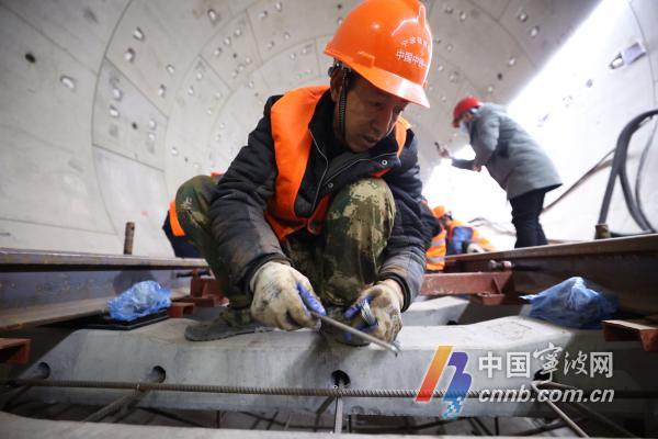 沉重的軌枕被吊入軌道,測量、捆扎……在寧波軌道交通3號線二期興海南路站約1000平方米的鋪軌基地,汽車吊不停卸貨、吊裝,工人們忙著安裝、澆筑,一派熱火朝天景象。