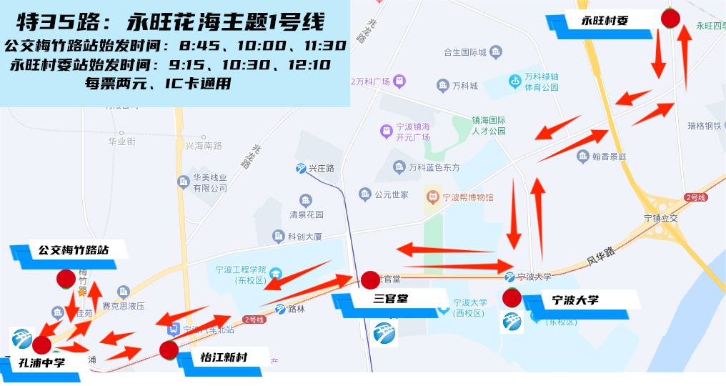 該線沿途經過公交梅竹路站↓、梅竹路中官新路口↑、孔浦中學、怡江新村、三官堂(浙江紡織服裝學院)、寧波大學,最后抵達永旺村。公交梅竹路站始發時間分別為:8:45、10:00、11:30,永旺村委站始發時間分別為:9:15、10:30、12:10。單程20分鐘,線路沿線經過軌道二號線孔浦站、三官堂(浙江紡織服裝學院)站、寧波大學站,市民朋友可在這些站點進行換乘。