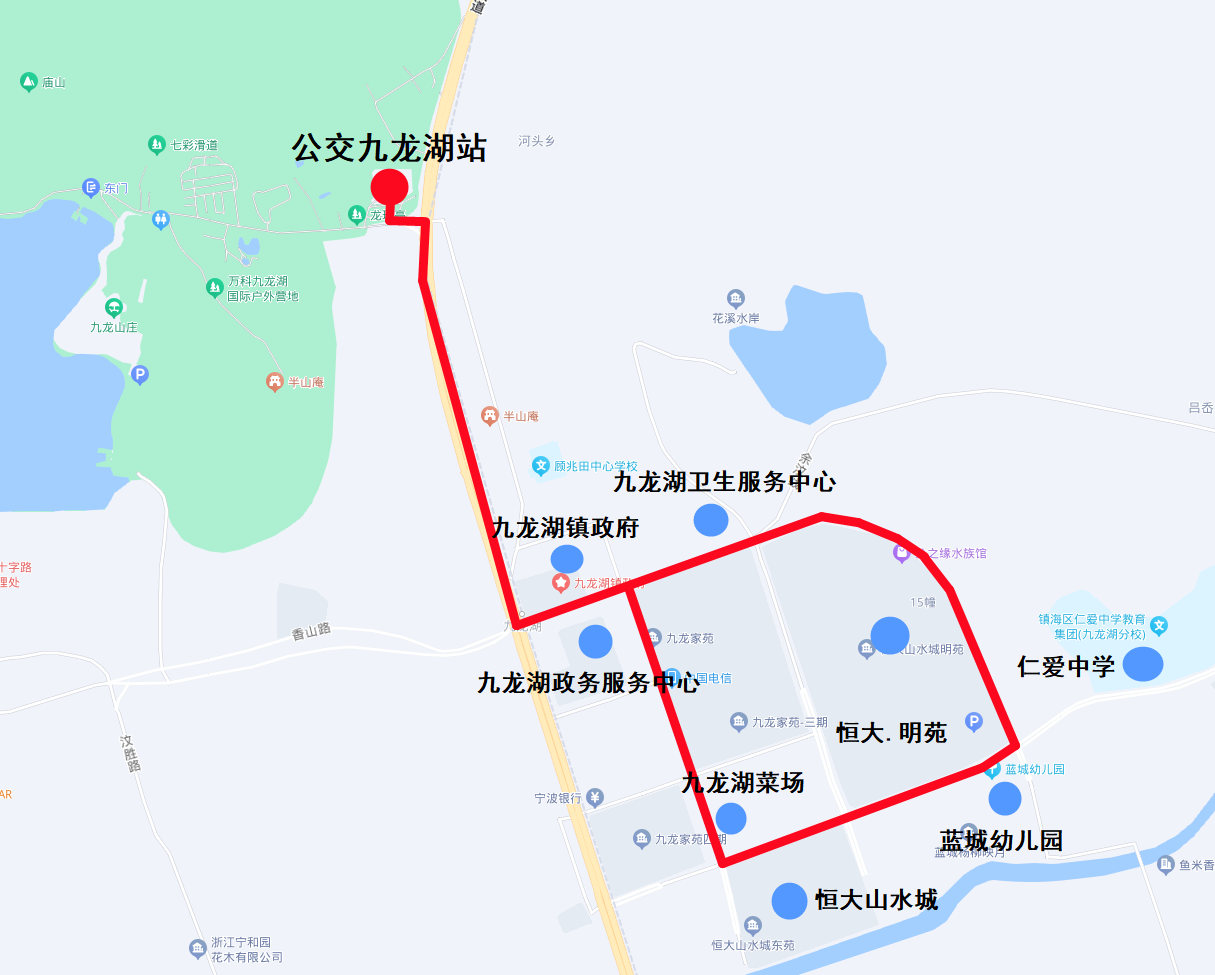其中外環線路走向為龍都北路、九龍大道、龍源路、御水路、滕山路、龍源路、九龍大道、龍都北路。站點設置:公交九龍湖站、九龍湖鎮政府、龍源路御水路口、招呼站(九龍家苑一期)、招呼站(御水路下徐路口)、九龍家苑南、滕山路龍源路口、招呼站(明苑東)、招呼站(龍源路龍都路口)、龍源路御水路口、九龍湖鎮政府、公交九龍湖站。