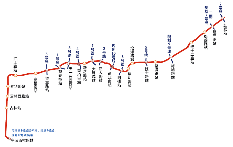 6號線一期工程為東西方向的市區線,串聯城市新舊核心區、重要產業功能區、衛星城鎮以及機場等重要交通樞紐,線路西起寧波西樞紐,經古林、集士港、高橋、三江口核心區、高新區,最終到達北侖區小港。