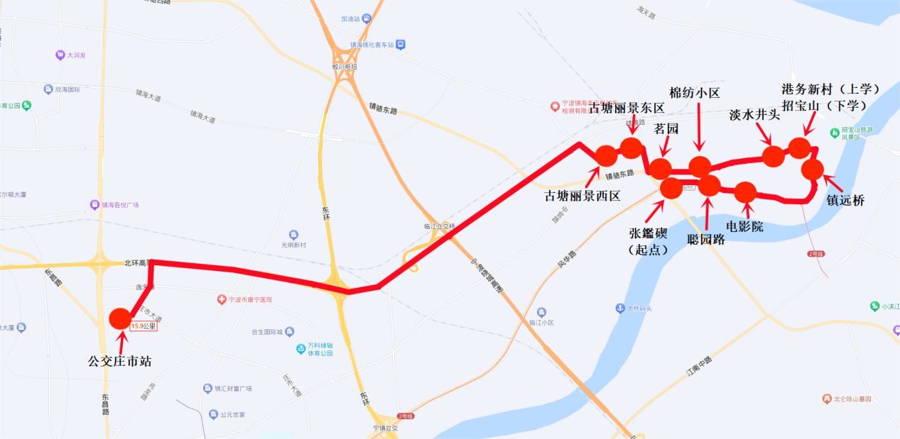 站點設置:公元世家、莊市街道行政服務中心、漢塘路逸夫路口、招呼站(鎮海區實驗小學南門)