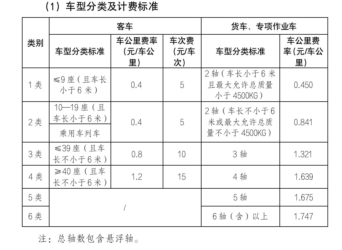 相關車型的收費里程,詳見下表(最終收費標準以省政府批復為準):