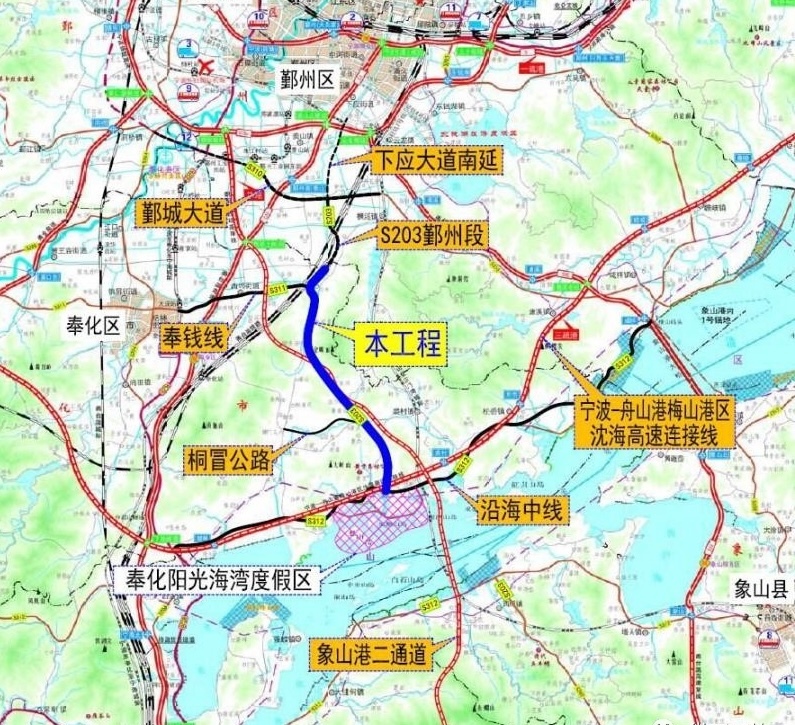 S203省道奉化段工程(金峨至應家棚段)起點位于白莼線與新金線交叉口,沿線經過西塢街道、莼湖街道和裘村鎮,終點與沿海中線交叉,全長13公里。工程工期約36個月,預計2024年6月完工。