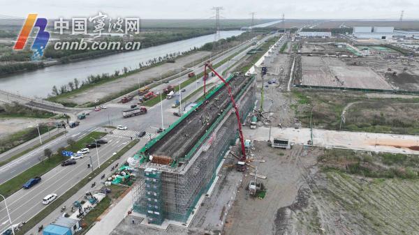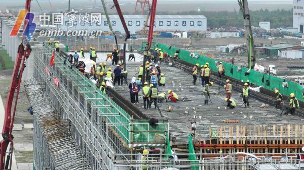 前晚8時18分,在前灣新區龍寶路東側施工現場,經過20個小時連續奮戰,通蘇嘉甬高鐵特大橋A段首聯連續梁完成澆筑,標志著橋梁上部結構施工正式拉開序幕,項目建設全面開啟加速度。