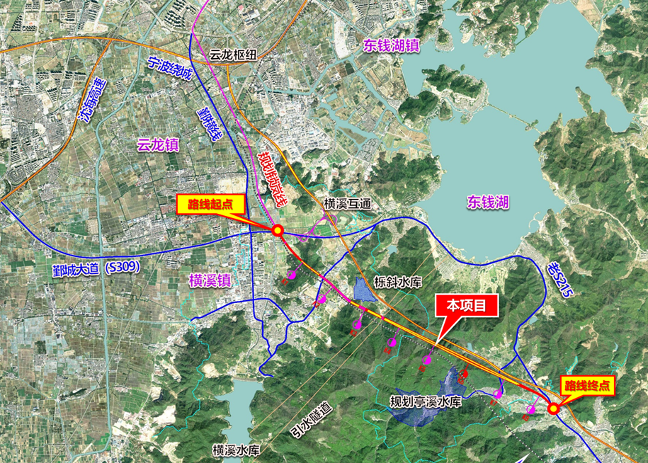 該項目位于鄞州區(qū)橫溪鎮(zhèn)和東錢湖鎮(zhèn),為規(guī)劃309省道的一段,全長約8.057公里,路線起于甬莞高速櫟斜互通西側的鄞城大道,與規(guī)劃的鎖嵐路相接,路線向東南方向,共設置四座隧道,終點在東錢湖鎮(zhèn)俞塘村與現狀盛寧線相接。