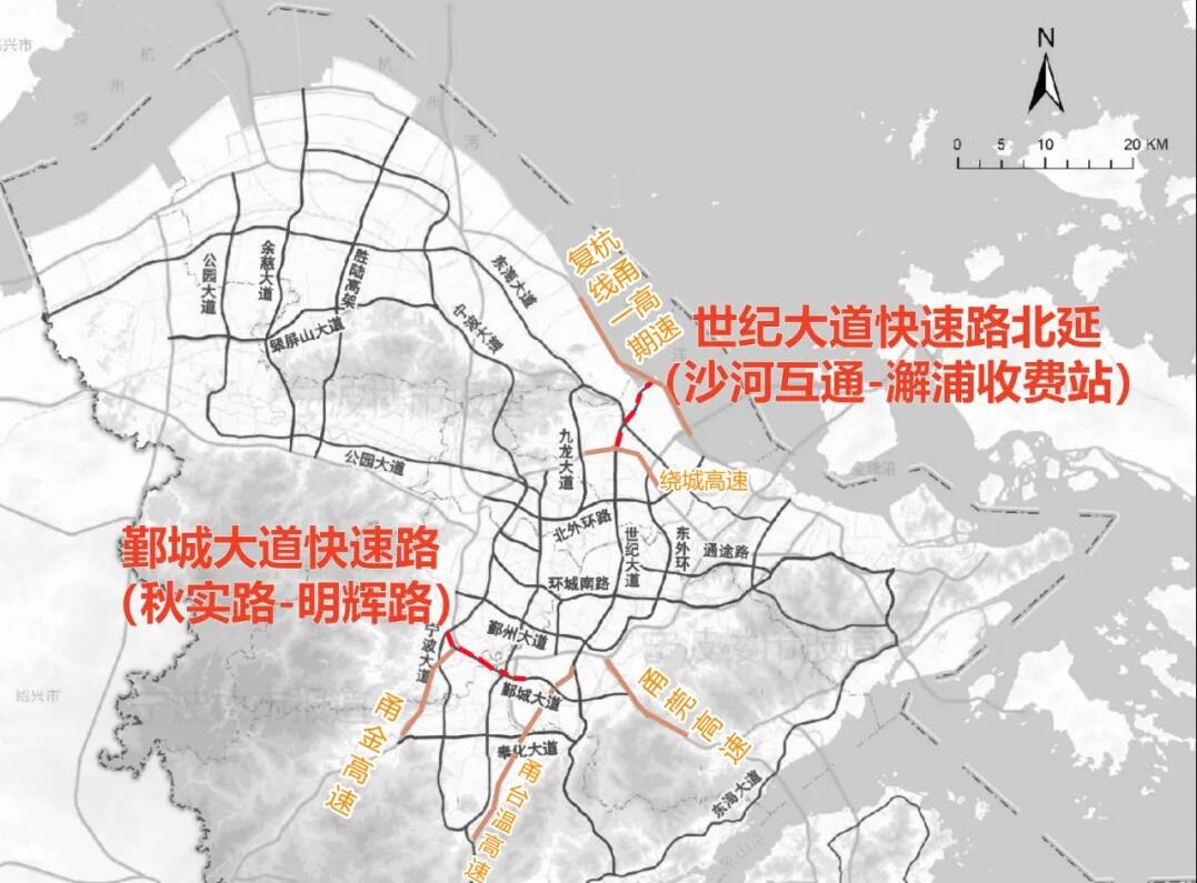 2條快速路,分別是世紀(jì)大道快速路北延(沙河互通-澥浦收費(fèi)站)、鄞城大道快速路(秋實(shí)路-明輝路)。