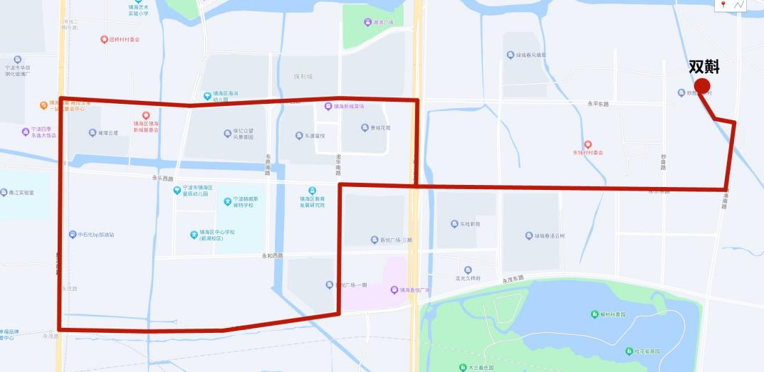 (二)停靠站點:雙斢、永樂東路妙音路口、永樂東路永樂東路366弄口、永樂東路望海南路口、永平西路金華南路口、永平西路西大河路口、鎮海新城管委會、慈海南路永平西路口、永茂路地鐵站、招呼站(尚志村委)、吾悅小區、永樂西路金華南路口↓、永樂東路望海南路口、永樂東路永樂東路366弄口、永樂東路妙音路口、雙斢。