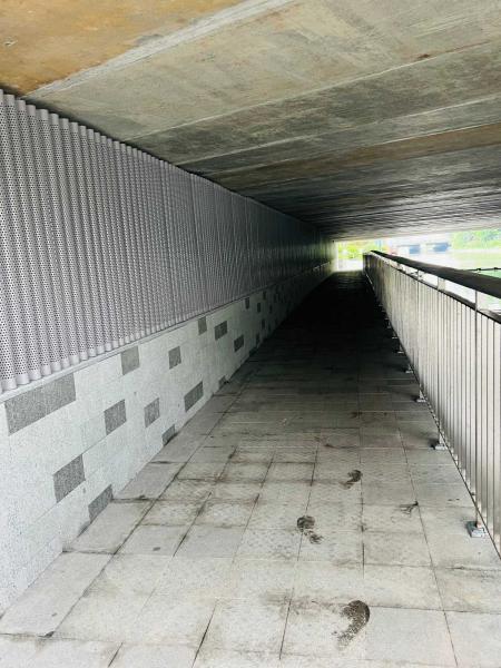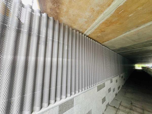為提升景觀品質(zhì),在下穿通道工程中,市政園林管理科從設(shè)計到施工實施全過程指導(dǎo),在通道入口周邊種植了風(fēng)車茉莉、迷迭香等花境植物,精心打造綠化景觀。通道內(nèi)墻面采用圓形鏤空金屬板裝飾,既隱藏?zé)魩в衷鎏砻栏校归g通行更顯溫馨。