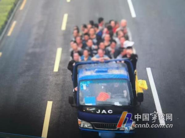 今年6月,鄞州區走馬塘附近的公路上,交警叫停了兩輛嚴重超員載人的貨車。只見30多人密密麻麻地站在狹小的貨車車斗內,幾乎靠人擠人維持平衡。