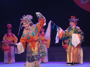 是的,紅花需要綠葉扶。如果沒有鎮海京劇聯誼會的票友為她配戲(2個太監、8個宮女),這戲自然唱不成。而后來演出要把宮燈、掌扇、香爐、扶節等道具從鎮海運到寧波,是江東區文聯領導為他們解決了車輛問題。沒有道具,這戲也唱不成。