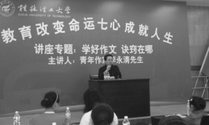 應(yīng)桂林新路程職業(yè)學(xué)校的邀請,本報(bào)主編、七心作文主編李永清先生于日前赴桂林理工大學(xué)講座,為300多位家長和學(xué)生送去了作文學(xué)習(xí)的技巧。李永清老師精彩、獨(dú)到的講座,受到了家長的好評,也讓聆聽講座的孩子們感受到了作文寫作的快樂。