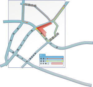 因輕軌2號線(石碶站)施工需要,鄞縣大道與雅戈爾大道(34省道)交叉口于2012年2月14日—2014年12月31日進行占道施工。在此期間,鄞縣大道與雅戈爾大道交叉口北側路段,約305米長,東側車行道封閉施工,只能確保雙向兩機+兩非。而該路口東側北側道路封閉,西側非機動車道需要借人行道通行。