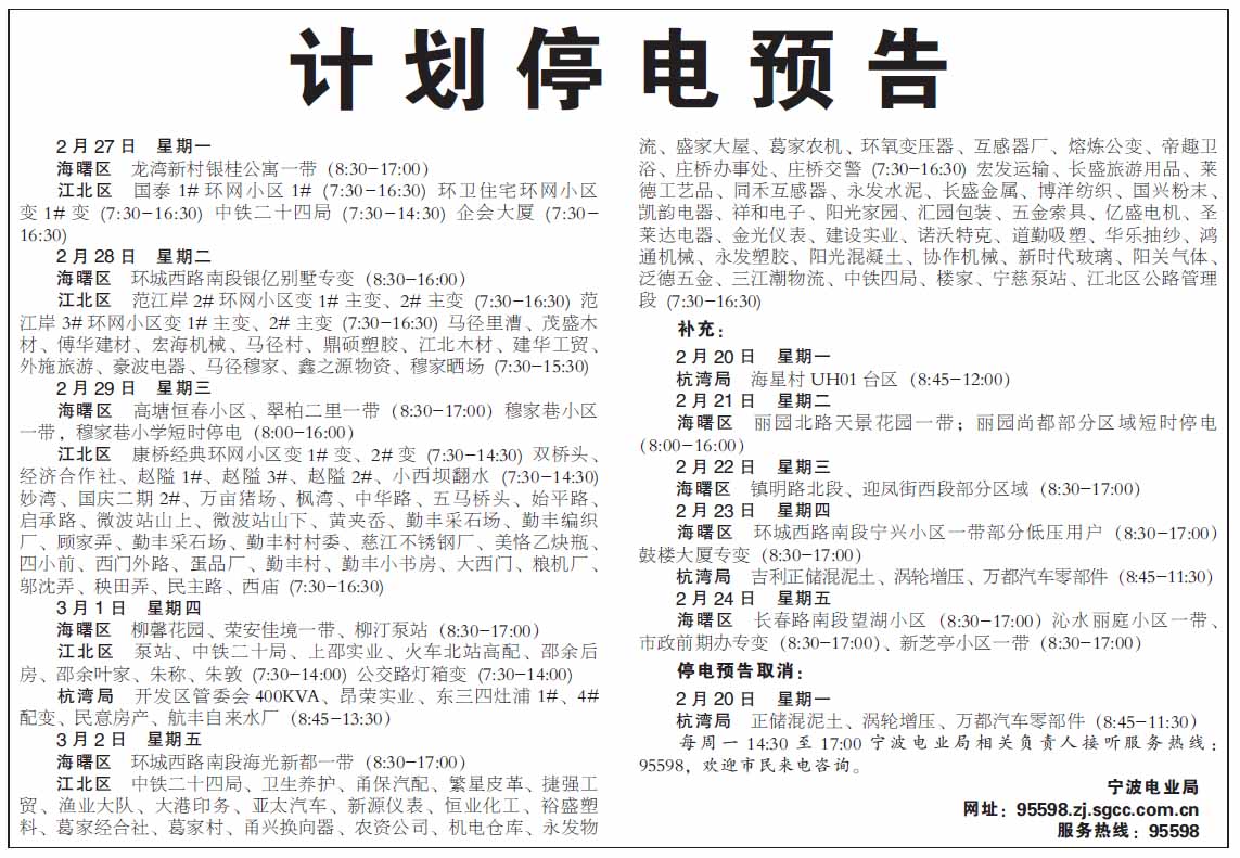 寧波電業(yè)局計(jì)劃停電預(yù)告