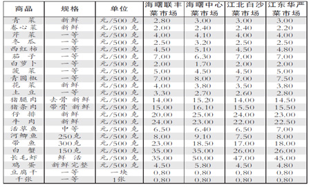 本期菜市場商品價格總水平微幅下跌0.68%。在35種監測品種中,價格周環比下跌的有12種、上漲的有9種、持平的有14種。從種類來看,蛋、魚、肉、蔬菜類均價分別下跌3.50%、1.60%、0.90%、0.51%;豆制品類均價上漲0.11%。從具體品種來看,菠菜、青瓜、長毛蝦、白蟹、花菜價格分別下跌9.32%、8.75%、5.41%、4.76%、3.89%;茄子、冬瓜、土豆價格分別上漲6.42%、4.11%、3.50%。