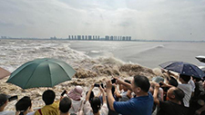 錢江潮奔騰而來 錢塘江畔上演年度“追潮”大片