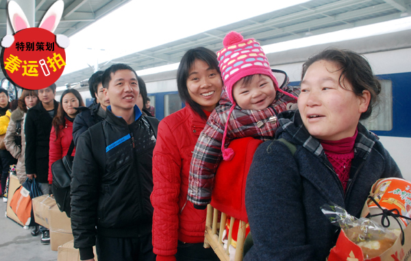 這張圖片是上午我在火車東站抓拍到的,這趟列車是由寧波發往貴陽,在寧波打工的人們回貴陽過年,排隊次序很好,沒有擁擠現象;一個超可愛的小娃娃在媽媽背上露出了純真的笑臉。好溫馨的一幕呦!