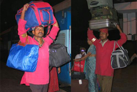 印度男人頭頂行李趕春運