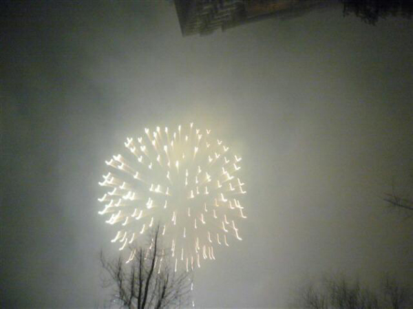 夜空中煙花在樹尖開花四射,遠遠望去好一幅“火樹銀花”的畫面!很“給力”!!