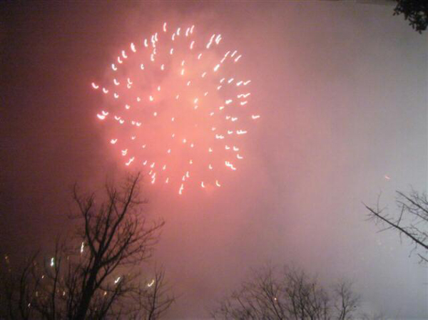 夜空中煙花在樹尖開花四射,遠遠望去好一幅“火樹銀花”的畫面!很“給力”!!