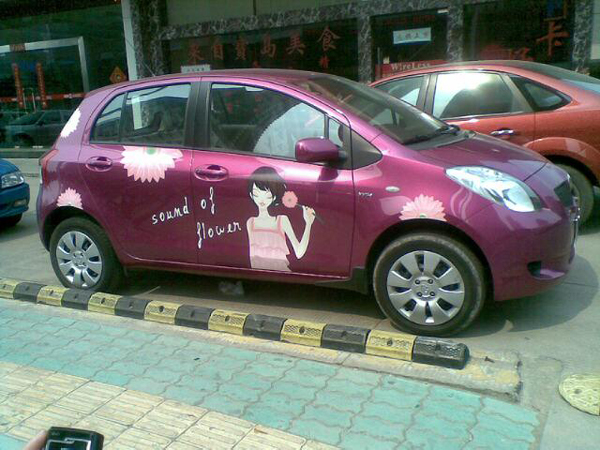 昨天中午出去吃飯,看到路邊停著一輛手繪的動漫小轎車,給原本單調的車色增添了濃郁的浪漫氣息,好一道亮麗的城市流動風景線!要是堵車,開車的朋友們興許還能用它來緩解疲勞呢!!!!