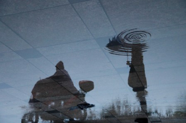 雨,江浙連續降雨。在紅綠燈路口的擋雨蓬下等,擋雨蓬漏出的一個洞,滴下的水珠正好落在行人倒影的傘頂。