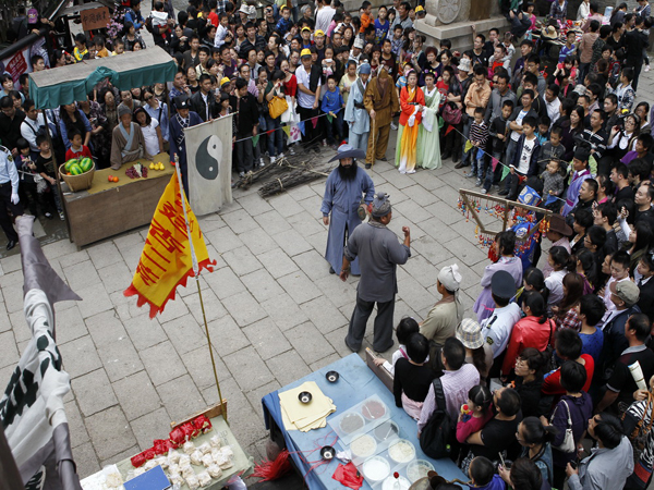 后來問了影視城的工作人員才知道他們正在推出“看新版《水滸傳》游象山影視城”活動,游客在逛影視城的同時可以看他們工作人員表演的《楊志賣刀》、《李逵審案》、《武松大鬧獅子樓》等影視劇經典片段。