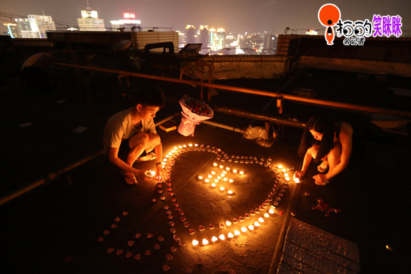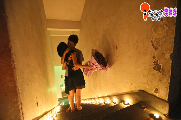 剛開始他女朋友不知道這一幕,小伙子先打電話讓她來到屋頂,小伙子的女朋友很是驚喜,他們擁抱在一起陶醉在幸福中......接著他們倆一起把剩下的蠟燭點燃,浪漫之情充滿了整個屋頂!